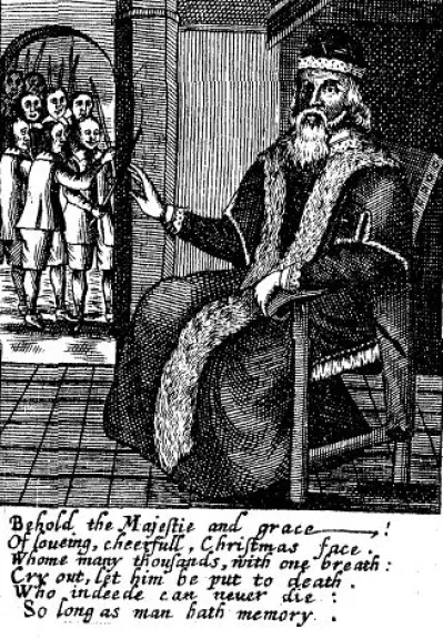 Villancicos ingleses del siglo XV hacen referencia a un “Sire Christmas”. La imagen que reproduce El Cordillerano corresponde a la obra de Josiah King “The examination and tryal of Father Christmas” y data nada menos que de 1686. Se publicó poco después de que la Navidad se volviera a considerar festiva en Inglaterra, porque en épocas de guerra civil se la había prohibido por símbolo de “superstición católica y autoindulgencia impía”.