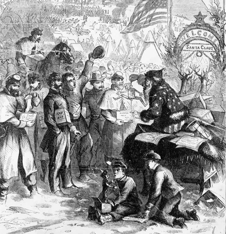 Hacia 1863 el dibujante Thomas Nast redondeó más todavía el aspecto actual de Papá Noel con una ilustración que se publicó ese año en un número de Harper's Weekly. En realidad, formaba parte de una ilustración mayor que se tituló “A Christmas Furlough (Un permiso navideño)”. Por entonces, ya estaban presentes los accesorios del reno, el trineo y otros, aunque el traje no había adquirido su color rojo definitivo. En efecto, durante varias décadas se representó a Papá Noel con vestimenta azul, verde o amarilla.