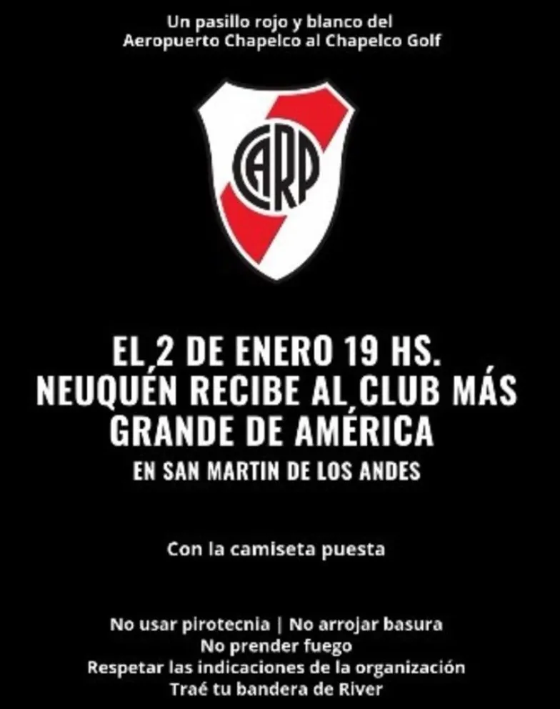 “El 2 de enero, a las 19, Neuquén recibe al más grande de América”, anuncia el primer flyer de un video que recopila los recibimientos de años anteriores. “Un pasillo rojo y blanco desde el Aeropuerto Chapelco hasta el Chapelco Golf” es la consigna central del banderazo que, como en ediciones previas, promete cubrir los 8,6 kilómetros de Ruta 40 que separan el aeropuerto de San Martín de los Andes del complejo donde se alojará River.