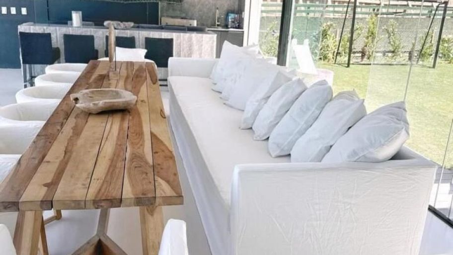 La mansión no pasa desapercibida. Se trata de una casa de gran escala, con diseño moderno, líneas limpias y una impronta muy ligada al lifestyle que Pampita suele mostrar: ambientes amplios, grandes ventanales, paleta de colores neutros y una fuerte presencia de madera natural en pisos y detalles arquitectónicos. Todo pensado para que la luz sea protagonista.