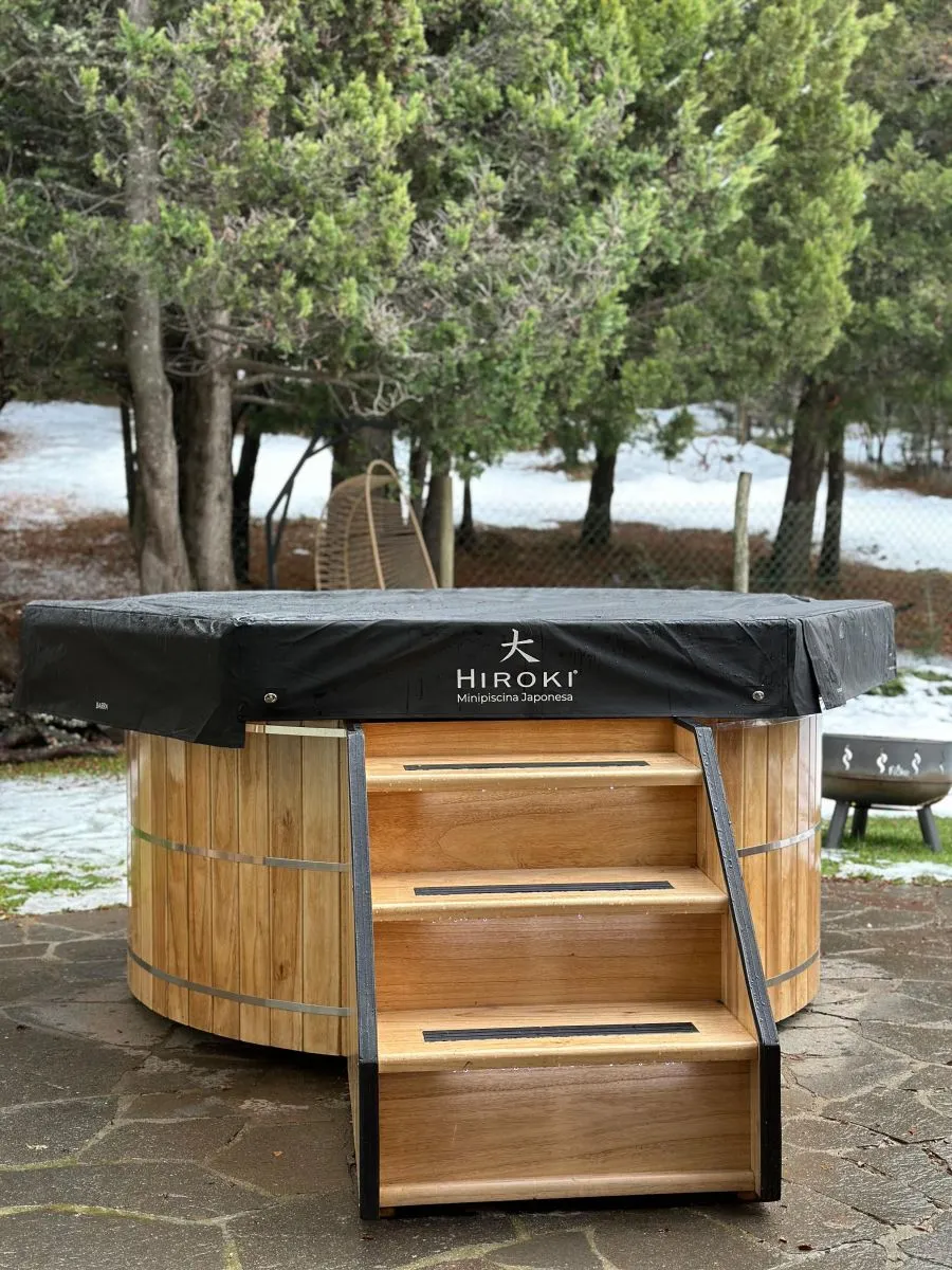 Modelo Patagonia a Leña: el emblema de Hiroki en la región cordillerana. Este modelo recupera la tradición del hot tub nórdico y el ofuro japonés, utilizando leña como fuente de calor. Su gran ventaja es la autonomía: no requiere conexión eléctrica ni gas, permitiendo instalarlo en lugares recónditos como cerros, orillas de lagos o cabañas alejadas. El ritual de encender el fuego, agregar leños y homogeneizar la temperatura con el remo de madera convierte el baño en una experiencia sensorial completa. Capacidad para 3-4 personas.