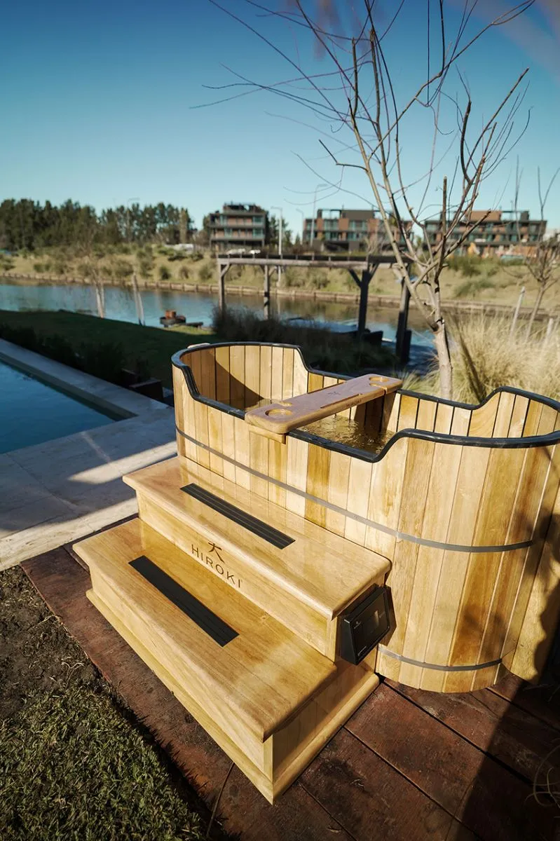 Un detalle fundamental: Hiroki recomienda que las minipiscinas cuenten con algún tipo de reparo solar. Puede ser un alero, una pérgola, un quincho o cualquier estructura que genere sombra. Esto protege la madera de kiri de la exposición solar directa prolongada —preservando su belleza natural por más tiempo.