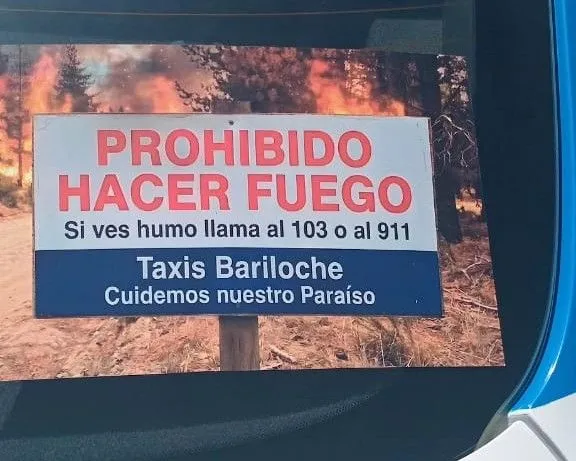 En Bariloche, los taxistas se organizaron para colocar cartelería en las unidades con el objetivo de concientizar sobre el peligro del fuego, incorporando información sobre líneas telefónicas para realizar denuncias.