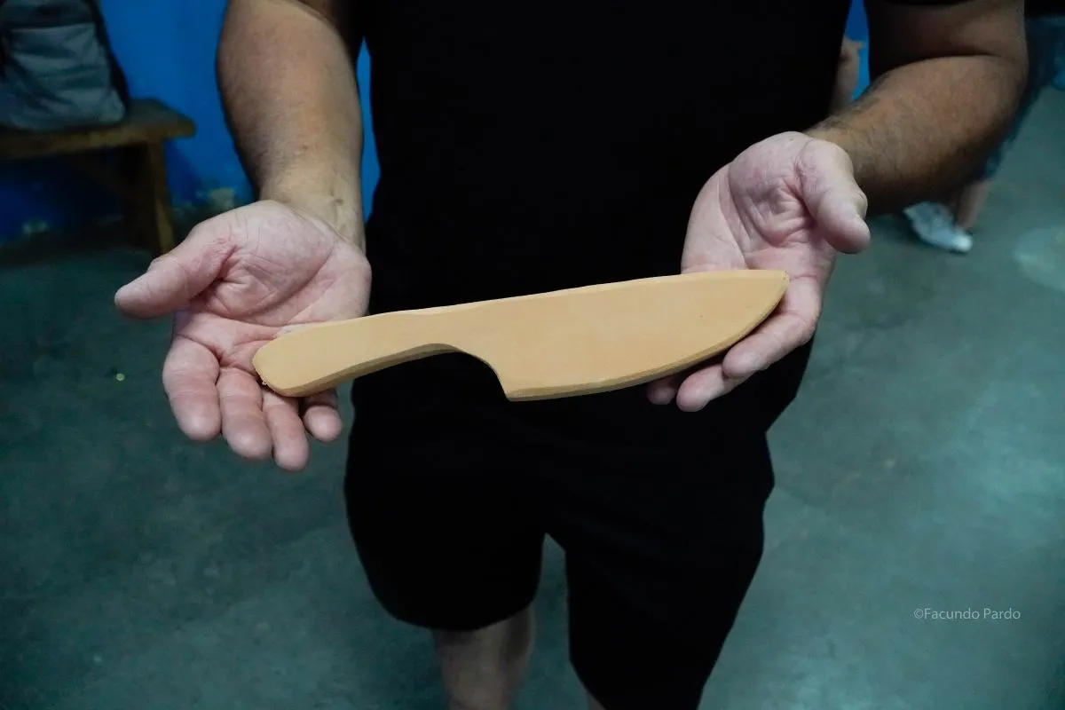 —Generalmente, trabajamos con cuchillos de goma, que son los que se usan cuando se realiza como práctica deportiva. O, en algunos casos, utilizamos de madera. Además, tenemos de aluminio, con los cuales hacemos visteo.