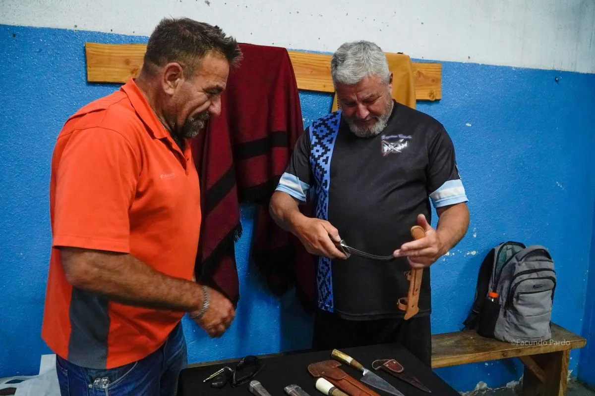 El héroe de Malvinas y forjador de cuchillos Edgardo Suárez, junto al "Pampa" López, habando de su tema favorito.