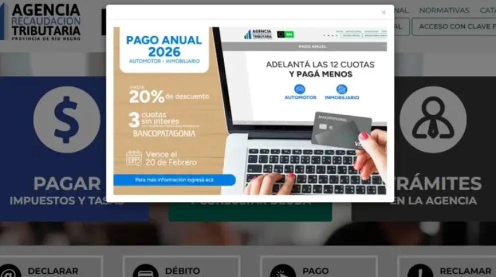 La Agencia de Recaudación informa que ya se encuentra disponible el Pago Anual 2026 de los impuestos Automotor e Inmobiliario, con descuentos de hasta el 20% por adelantar el año completo, y la posibilidad de abonarlo en cuotas sin interés.