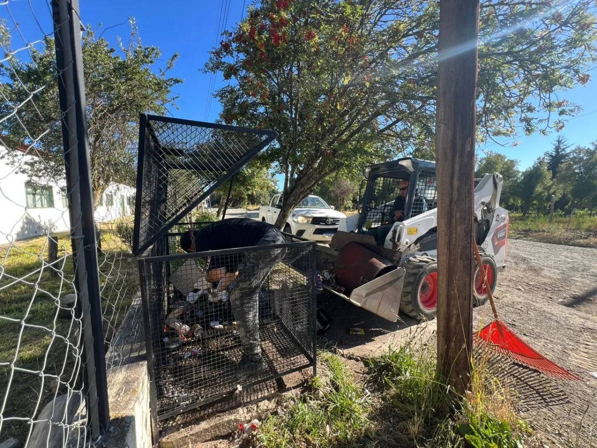 En el sector de la rotonda del kilómetro 8 de avenida Pioneros, frente a la Escuela Primaria N° 321 y la ESRN N° 123, se desarrollaron tareas integrales de limpieza a partir de la gran cantidad de basura acumulada en los tachos ubicados fuera de las instituciones.