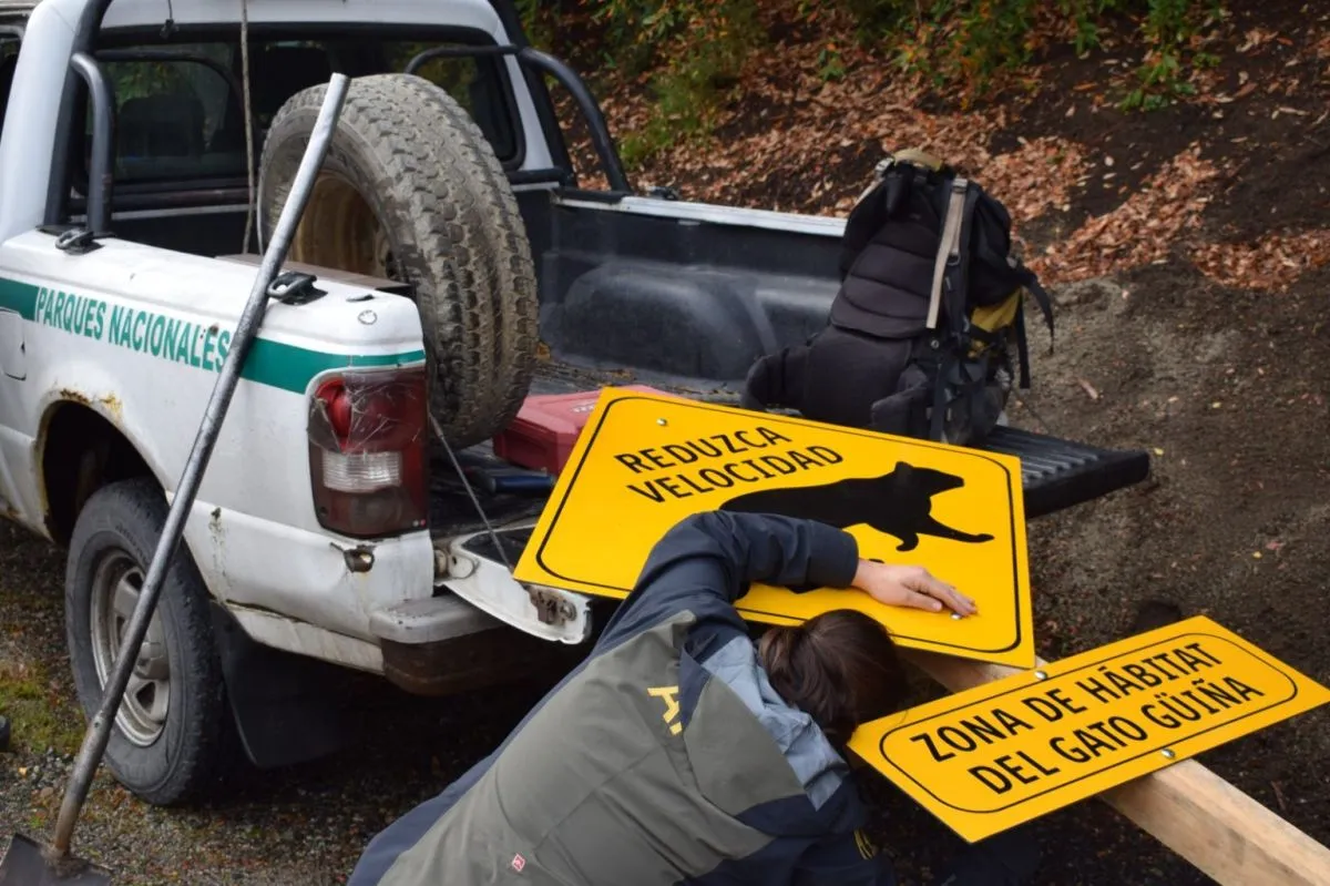 Tres de ellos fueron donados por el Guiña Working Group (GWG), grupo binacional entre Chile y Argentina dedicado a la conservación de la especie —del cual GECCaP forma parte— junto a la Fundación ConGarra de Chile, que los diseñó en el marco de la campaña de concientización #Lentoporlafauna. Los otros dos carteles fueron diseñados por profesionales del Parque Nacional Nahuel Huapi.