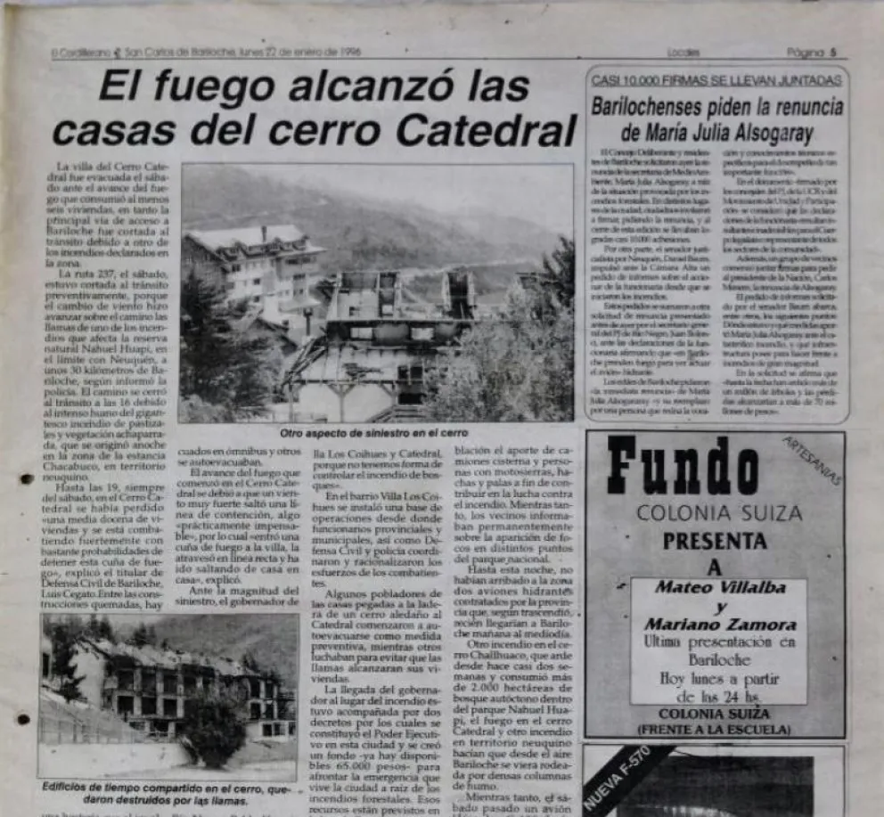 La temporada de incendios había comenzado temprano en 1996, pero hubo una tarde en la que se condensó el drama: a las 15:30 del 19 de enero el fuego se hizo realidad en la ladera norte del cerro Catedral y con velocidad inusitada las llamas alcanzaron 20 metros de altura. Apenas dos horas después, las autoridades dispusieron la evacuación de Villa Catedral. Inclusive hoy, cuando estamos muy familiarizados con las llamaradas del verano, sorprenderá la magnitud que 30 años atrás, alcanzó la destrucción ígnea.
