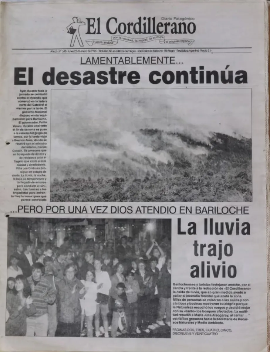 A 48 horas de su inicio, este era el panorama: “recorrer la ruta hacia Villa Catedral muestra a los ojos humo incesante en los distintos sectores de las laderas, mientras que, en otros, un paisaje desolador. En algunos, se apreciaba a lo largo de las horas de ayer, la labor de bomberos y voluntarios en una lucha denodada para impedir que el fuego se propagase, tarea ésta que demandó un esfuerzo que, en muchos casos, superó las fuerzas previstas”, anotaba este diario. Felizmente y como en Epuyén (Chubut) días atrás, fue la lluvia la que llegó para dar una considerable mano.