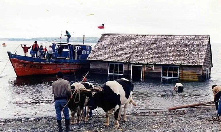 Matta Manzano cuenta que, en Chiloé, esa actividad es colectiva, debido a la colaboración entre vecinos para poder llevarla a cabo. “Incluso hacen que las casas ‘naveguen’”, apunta, ya que, en ocasiones, las colocan sobre embarcaciones para moverlas.