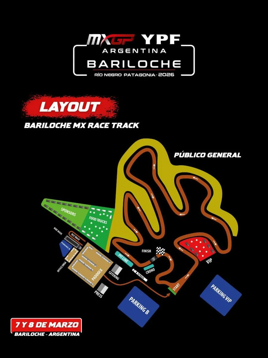 El epicentro del evento será el Bariloche MX Race Track, el nuevo escenario diseñado para recibir a la élite del motocross mundial. El circuito fue diseñado por el español Gabriel Villada y cuenta con una extensión total de 1.800 metros, un total de 21 curvas —11 a la izquierda y 10 a la derecha— y un sentido de giro antihorario, pensado para ofrecer un trazado técnico y exigente.