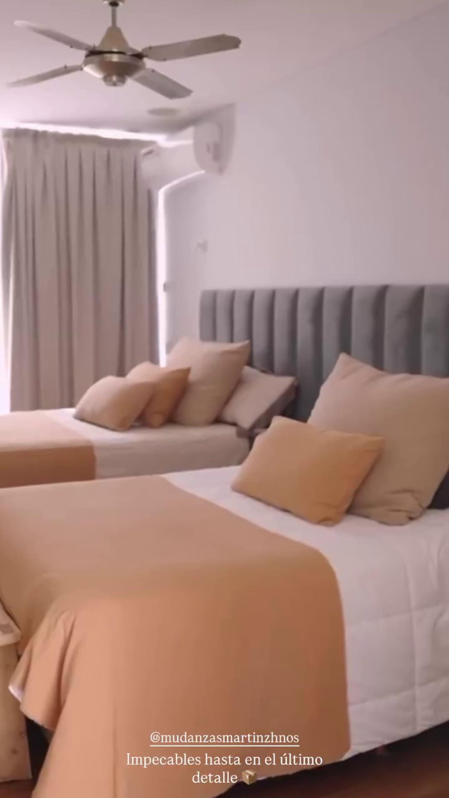 El dormitorio, por su parte, mantiene la misma línea estética. Las imágenes muestran dos camas prolijamente armadas, con respaldos tapizados en gris y ropa de cama en tonos beige y blanco. Las cortinas largas acompañan la entrada de luz natural y generan un clima cálido y relajado. Elementos como el ventilador de techo y el aire acondicionado terminan de consolidar un espacio cómodo, práctico y elegante.