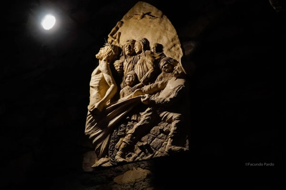 En otra imagen del vía crucis, se ve a Jesús en el encuentro con su Madre. Él, a través de su perfil, representa el contorno de Sudamérica. Ella, en tanto, aparece personificada por la Virgen de Guadalupe.