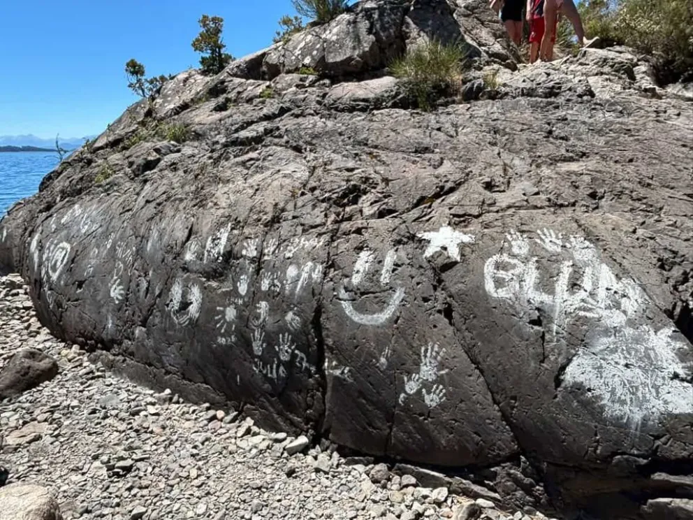 Se trata de una de las playas dentro del Parque Municipal Llao Llao. Mercedes habitualmente va a ese sector a disfrutar del verano y nadar en las aguas del Nahuel Huapi y este jueves, se encontró con varias pintadas sobre las rocas, lo que le generó gran indignación.