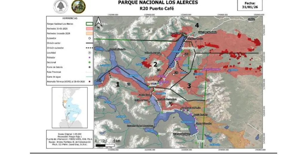 Las condiciones meteorológicas adversas y la simultaneidad de incendios en distintos puntos del país obligaron a reforzar y reconfigurar las estrategias de combate en el Parque Nacional Los Alerces, donde el fuego ya afectó más de 15 mil hectáreas.