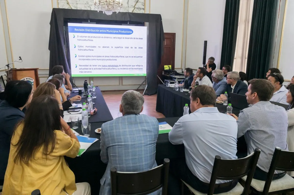 Acompañaron el Ministro de Gobierno, Trabajo y Turismo, Agustín Ríos, y la Secretaria de Hidrocarburos, Mariela Moya, quien expuso la nueva propuesta de revisión de la distribución. Fue la segunda reunión de la jornada, que se sumó a un encuentro previo con los 39 municipios para comenzar a analizar la actualización de los índices de coparticipación.
