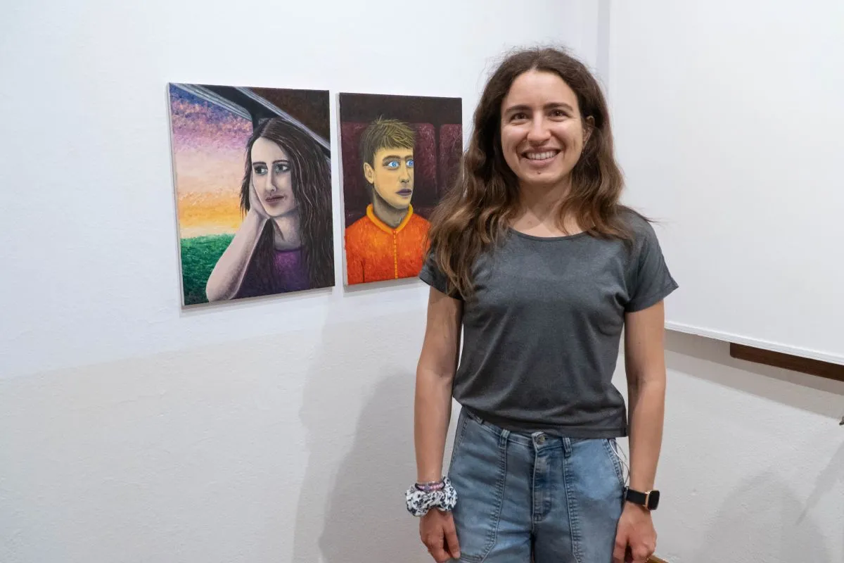 Milagro Torres, junto a sus cuadros de miradas especialmente expresivas (foto: Facundo Pardo).