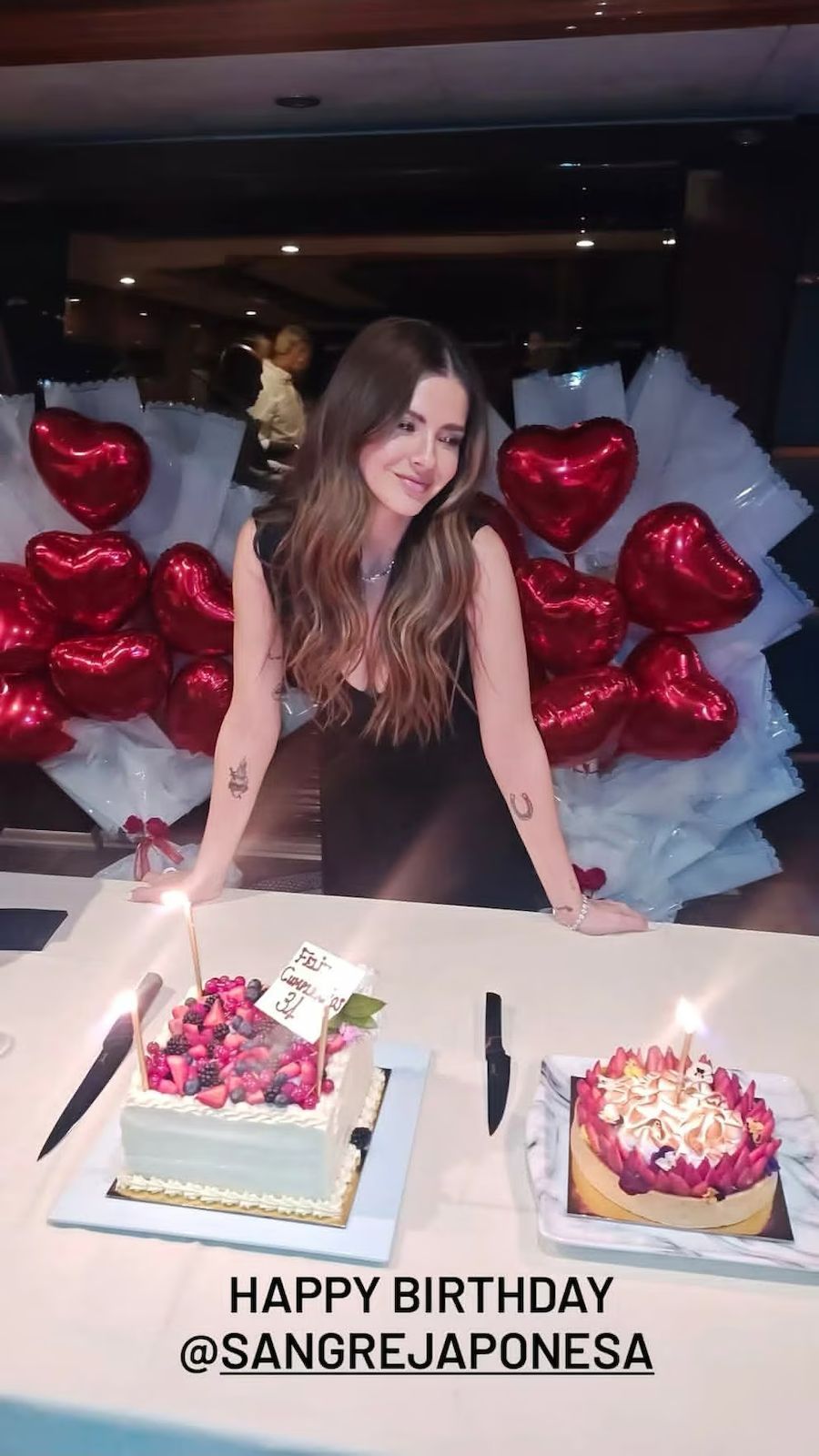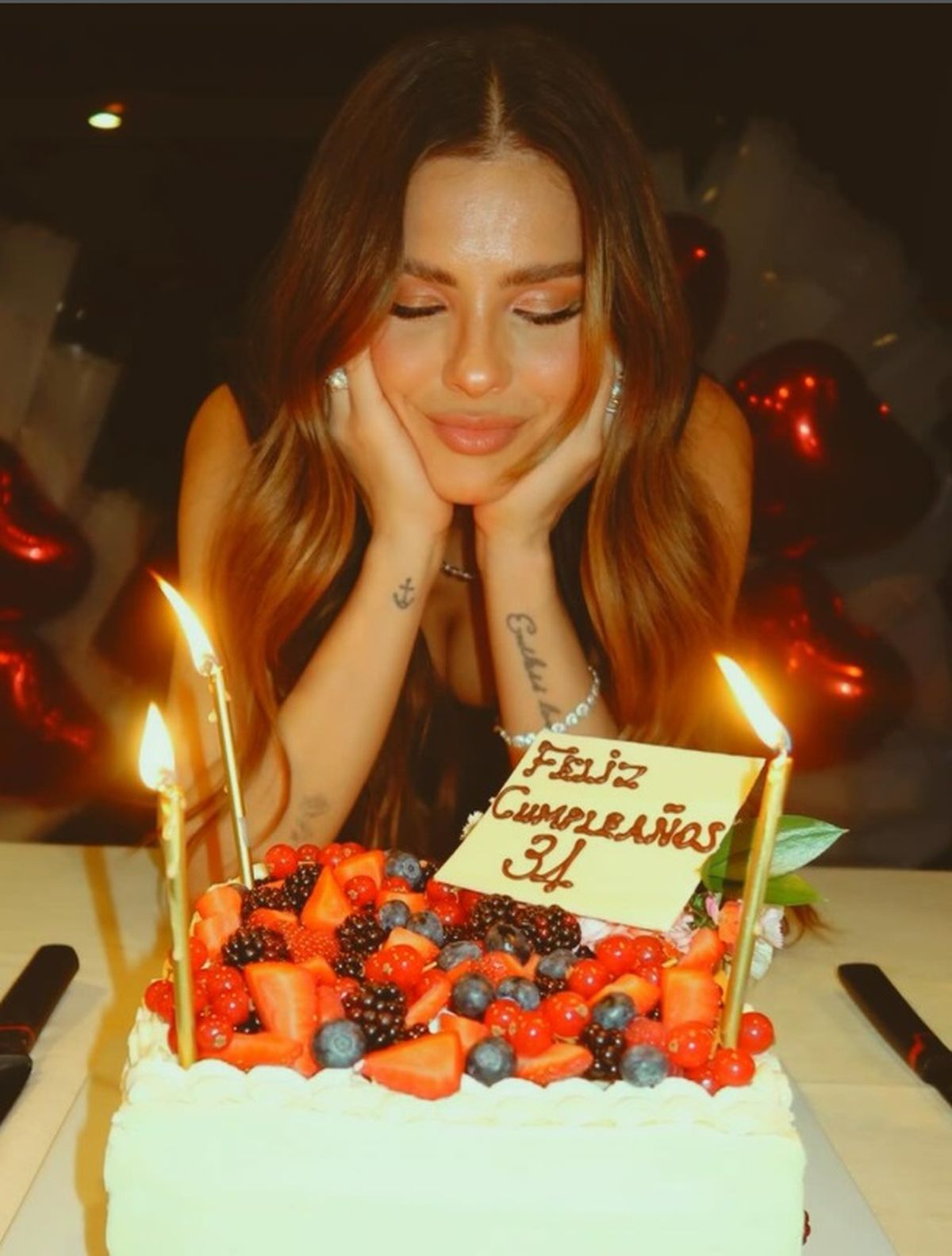 Entre los registros que compartieron quienes participaron del encuentro se pudo ver a la actriz soplando las velas cuando llegó la medianoche. Frente a ella aparecieron dos tortas preparadas especialmente para el momento. En una de ellas se destacaba un cartel con una frase simple que resumía el motivo del festejo: "Feliz cumpleaños 34".