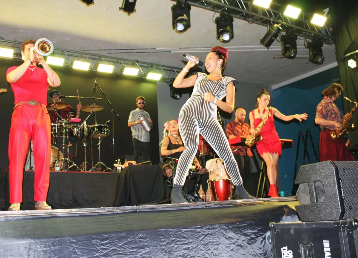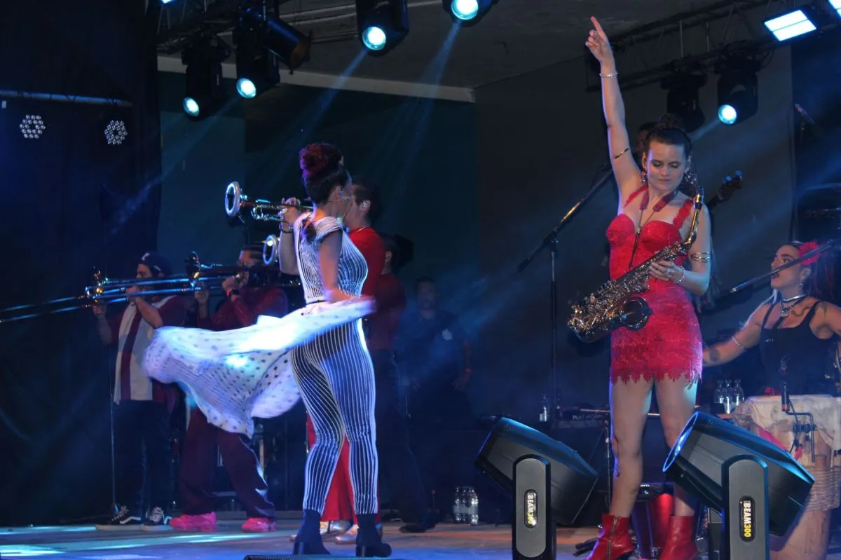 Los diversos vocalistas de la agrupación, en tanto, paseaban sus voces sobre ese contundente colchón sonoro. Pedro Rodríguez, con sus movimientos robóticamente ampulosos. Black Rodríguez brindando una cuota teatral a la música, con su fina barba larga y una actitud a lo Sandro, pero cumbiero, incluyendo la interpretación del Porque yo te amo, del Gitano, que arrancó alaridos femeninos desde al arranque, cuando entonó: “Con ese palpitar/ que tiene tu mirar…”. También Ximena Gallina, que en un momento dejó de golpear las palmas sobre el cajón para tomar el micrófono y cantar, transformándose en una sexy Harley Quinn cumbiera. Y, claro, Ivonne Guzmán, quien, tras un largo transitar en el sendero de la música, desde sus inicios en Bandana, pasando luego por Actitud María Marta, terminó por convertirse en la reina de la cumbia, en un eco de su infancia en Bogotá, cuando, gracias a su familia, su banda de sonido era de cumbiamba.