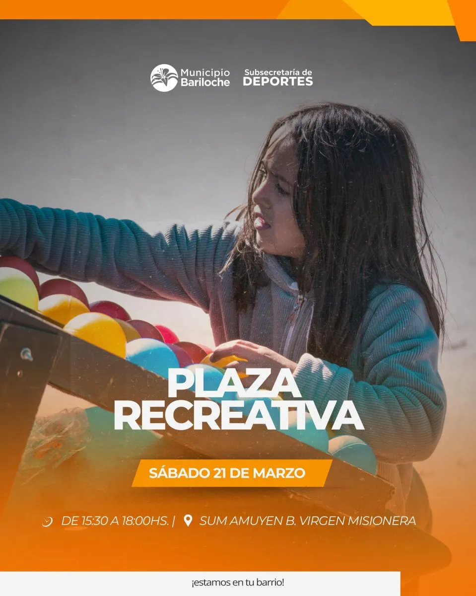La Secretaría de Deportes de la Municipalidad de Bariloche prepara una nueva edición de la “Plaza Recreativa”. El evento se desarrollará este sábado 21 de marzo, de 15:30 a 18:00 horas, en el SUM del Amuyen, del Barrio Virgen Misionera.