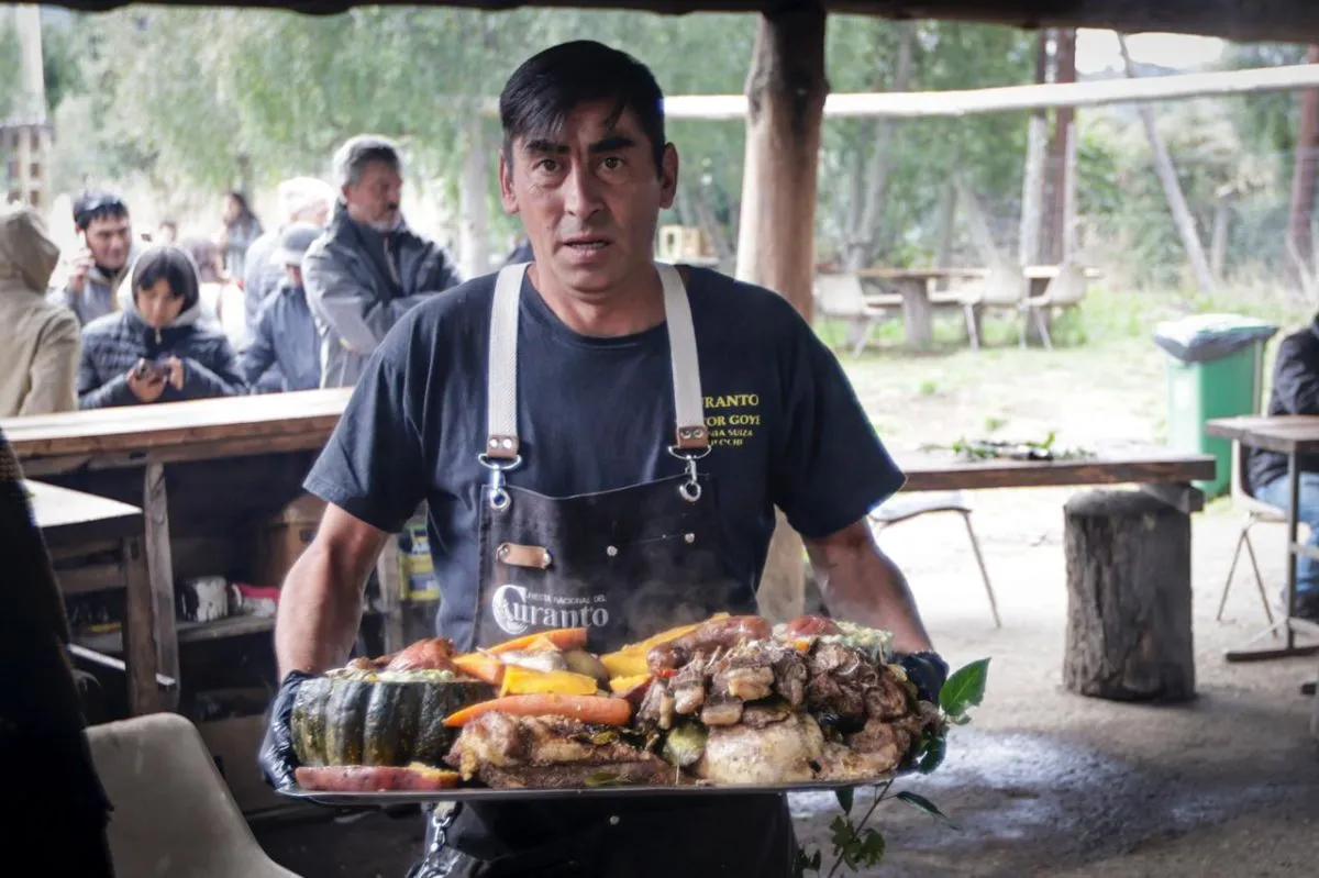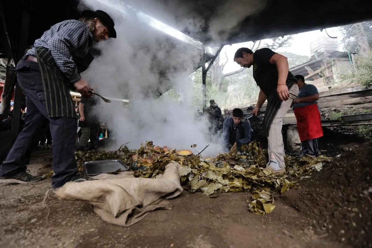 Sin dudas, el protagonista absoluto fue el curanto. Cientos de personas aguardaron con expectativa el instante en que los encargados retiraron la tierra y las hojas de maqui, dejando al descubierto las carnes y verduras cocidas sobre las piedras calientes.