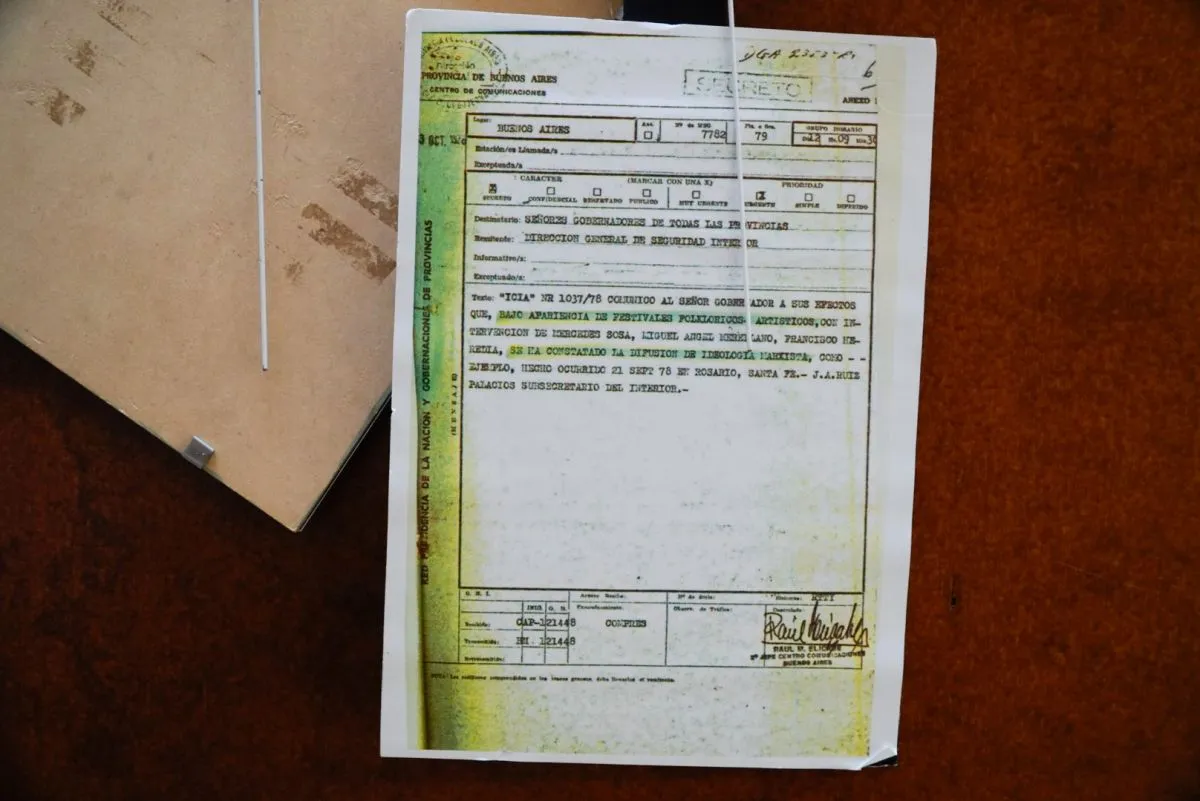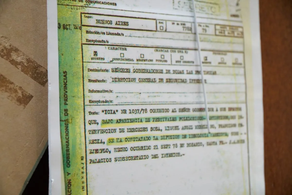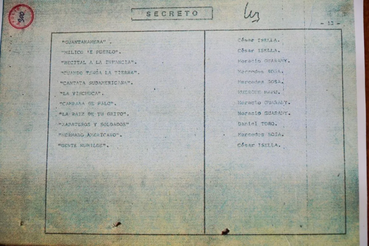 Por ejemplo, se indica que, “bajo la apariencia de recitales folklóricos”, constataron “la difusión de ideología marxista”. También se expone la detección de “material discográfico de contenido disolvente y/o subversivo”.