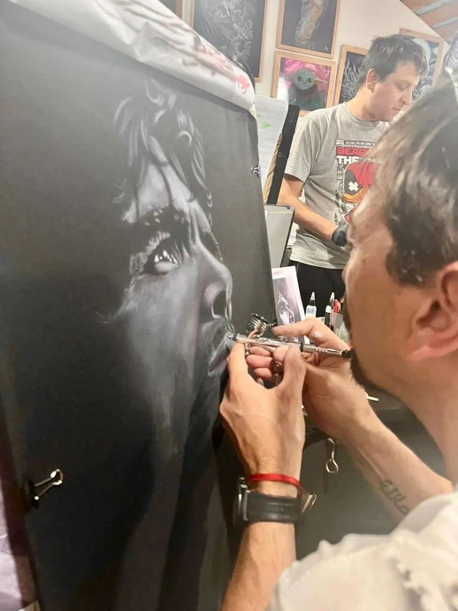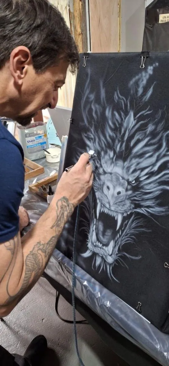 Alejandro señala que se usa “sobre indumentaria, en bastidores, chapas… Se utiliza para pintar en vehículos. También, para body painting”. De tal manera, ahonda: “Se pueden hacer diferentes tipos de trabajo, incluso hasta llegar a un realismo extremo. Hay obras que están casi al nivel de una foto. Tiene ese efecto, que no lo da ninguna otra herramienta. Y se trabaja por etapas, es decir, capas de pintura para ir logrando una especie de volumen, lo que provoca un realismo específico”.