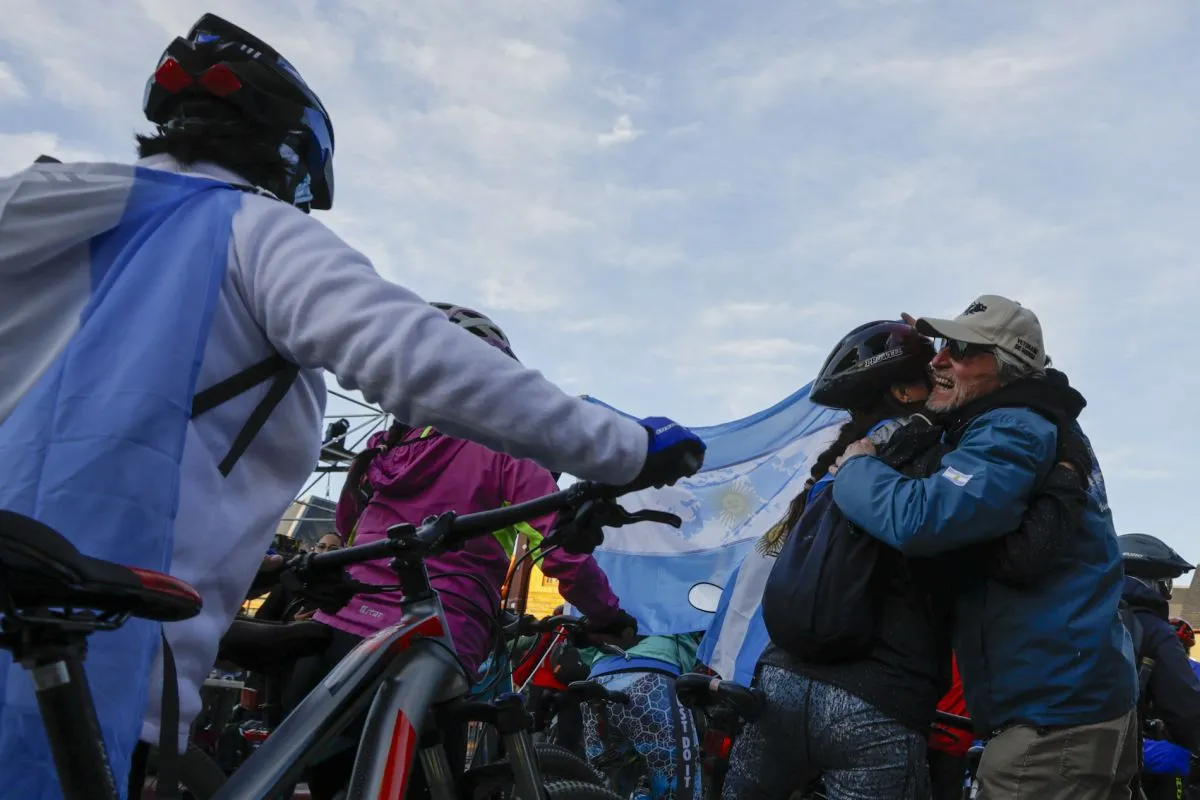Sin bajarse de la bicicleta, mientras llegaban los otros ciclistas, junto a los motociclistas que los seguían a modo de escolta motoquera, Edgardo se abrazó fuerte con el director de Veteranos de Guerra de Río Negro, Ruben Pablos, quien lo esperaba junto a otro veterano sosteniendo una bandera argentina que incluía el contorno de las islas.