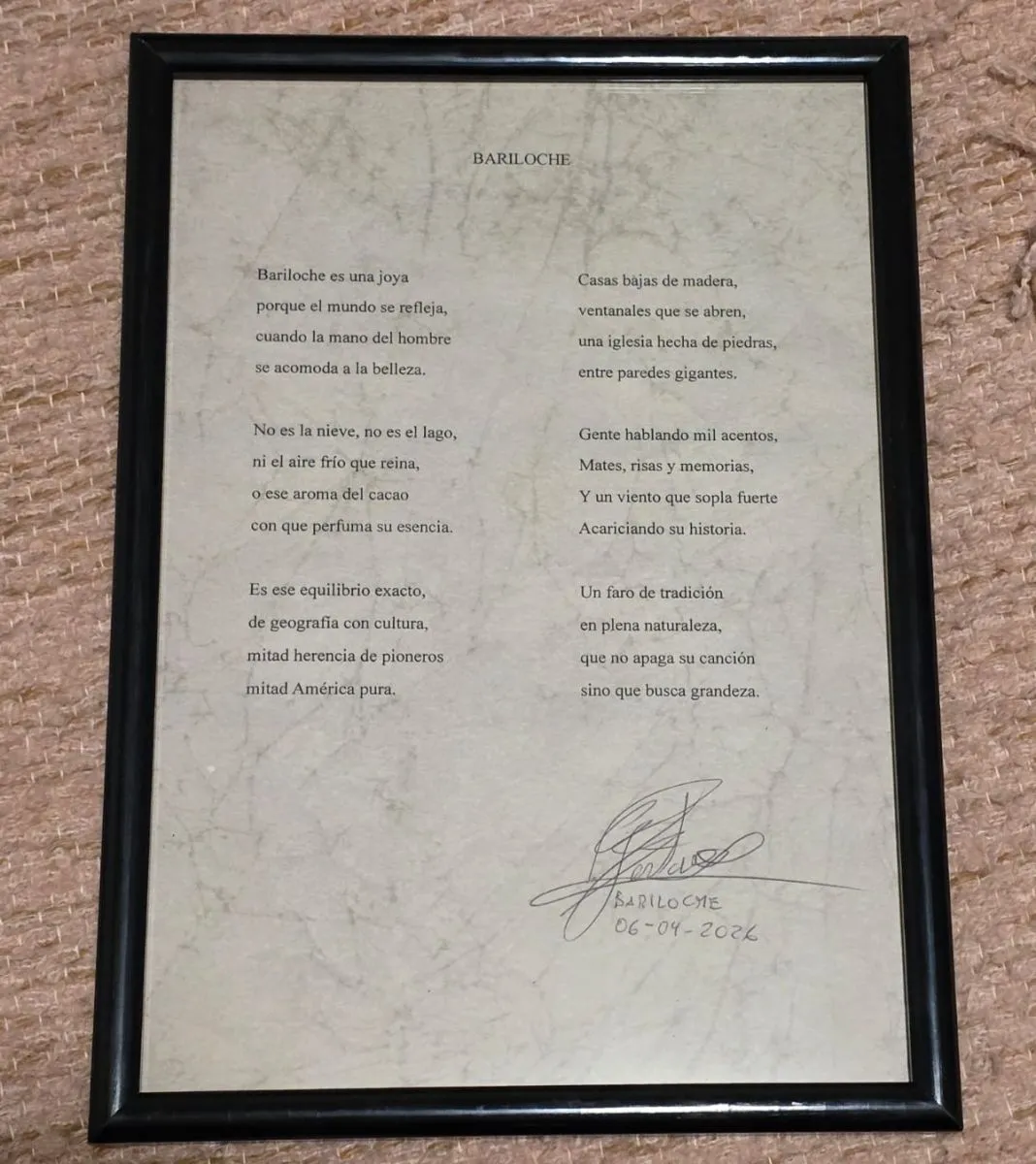 Prueba de ello es Bariloche, poema que escribió al arribar en esta última ocasión a la localidad, a la que suele venir cada vez que puede. Aquí tiene familiares, pero además siente una conexión importante con la ciudad. De hecho, su intención es, tras jubilarse de su profesión de abogado (es experto en derecho parlamentario), residir en esta parte de la Patagonia.