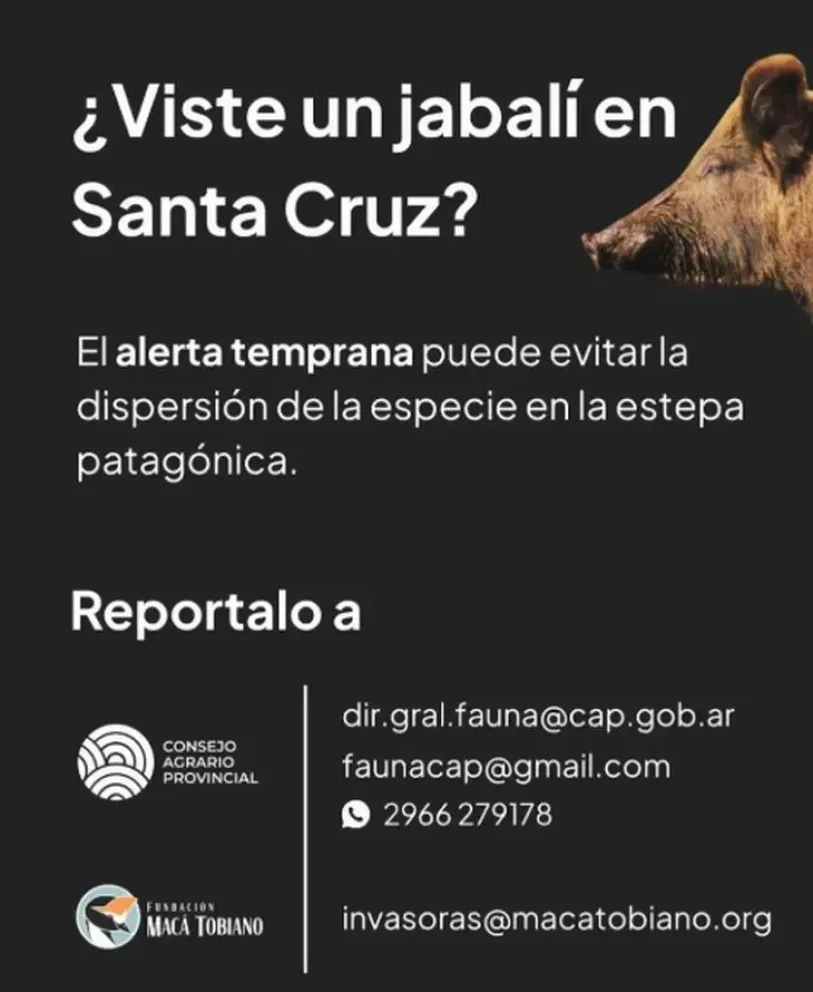 Por eso, la Fundación realizó un llamado directo a la comunidad: cualquier persona que observe un ejemplar de jabalí en territorio santacruceño debe realizar el reporte correspondiente ante las autoridades provinciales competentes o ante organizaciones especializadas. La información ciudadana es, en estos casos, parte fundamental del sistema de alerta temprana.