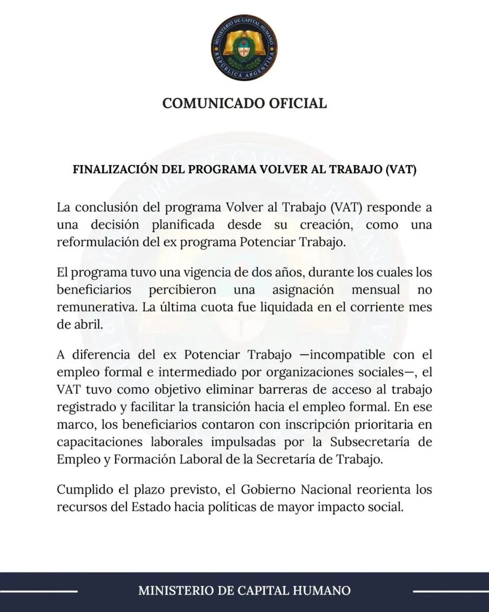 Este martes, el Ministerio de Capital Humano ha anunciado el término del programa 'Volver al Trabajo', una iniciativa que había sido concebida como una versión renovada del ex plan Potenciar Trabajo. Este programa tenía una vida útil preestablecida de dos años, y este mes se cumplió exactamente ese horizonte temporal, motivo por el cual la última asignación mensual fue efectuada, completando así las transferencias no remunerativas prometidas a los beneficiarios.