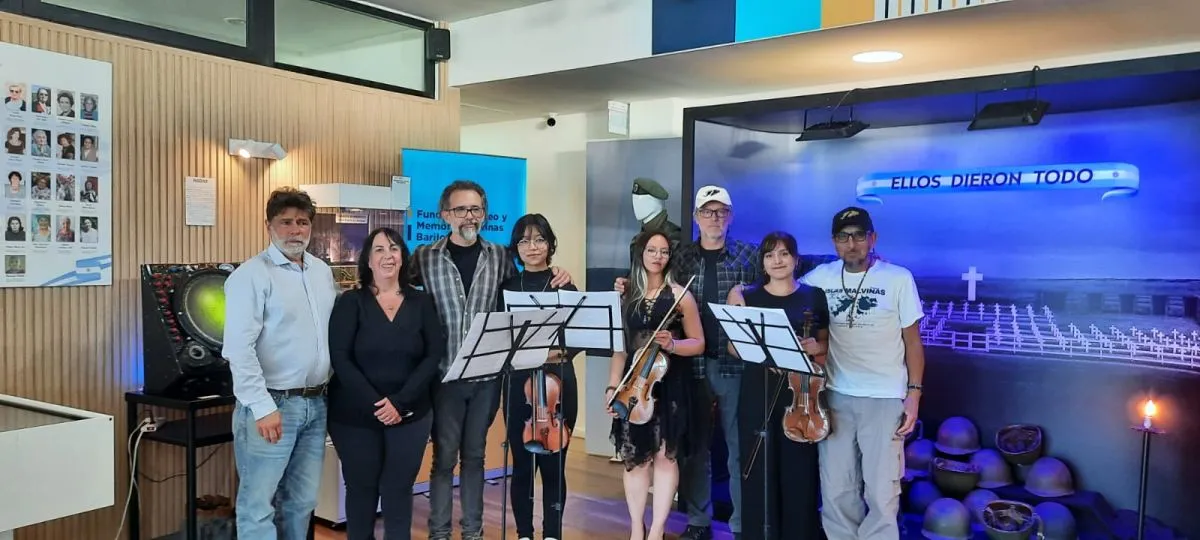 El director del museo, Carlos Bariggi; la gestora cultural Verónica Montero; el director de la Camerata Juvenil Municipal Bariloche, Mariano Videla; las jóvenes violinistas y veteranos de Malvinas, entre ellos, Ruben Pablos.