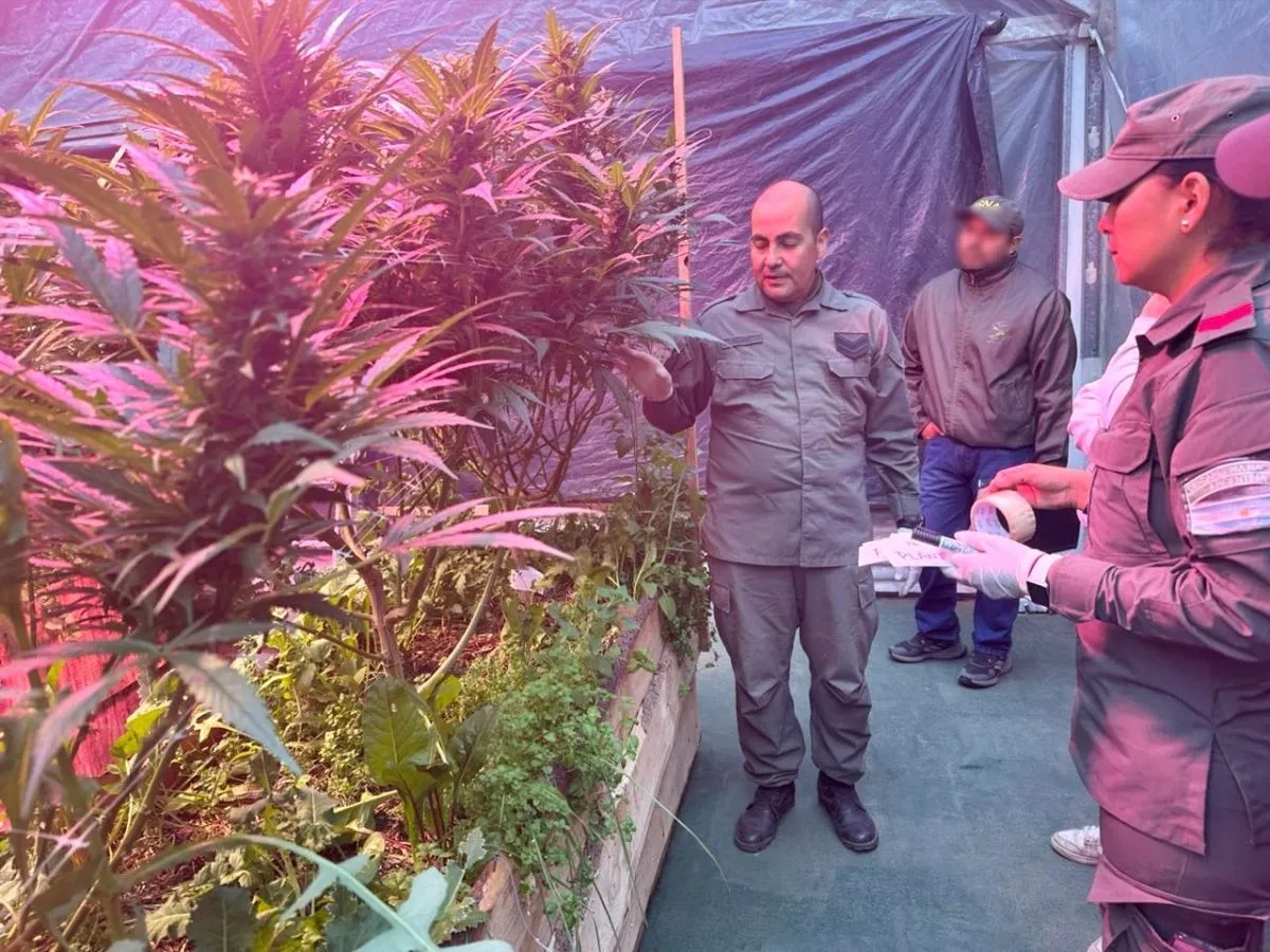 Durante el registro de una de las viviendas, los efectivos detectaron un invernadero de marihuana a gran escala, donde se cultivaban plantas de cannabis bajo sistemas específicos de iluminación, ventilación, resguardo y secado.