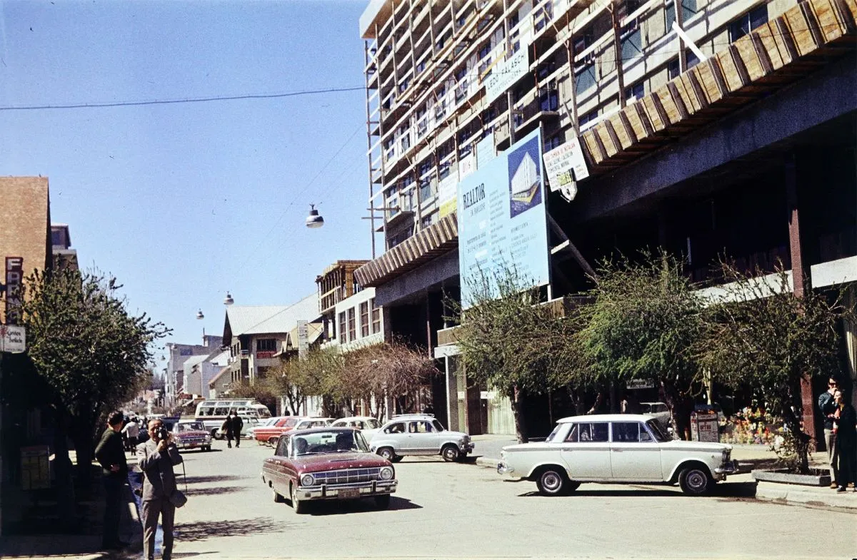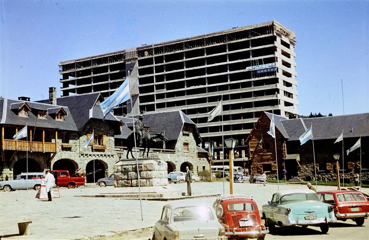 Pueden resultar gratas para los amantes de los fierros porque se advierten autos que hicieron historia en la Argentina en tiempos que la industria nacional era motivo de orgullo más que de desprecio: varios Fiat 600, algún 1500, los infaltables Ford Falcon, un Valiant, un Citroën 3CV, camionetas, una Estanciera y otros vehículos que el cronista no es capaz de identificar. Son imágenes que se tomaron en 1969 y evidencian la transición que padecía Bariloche por entonces: mientras la primera cuadra de la Mitre se caracterizaba por las habituales construcciones de dos plantas con techo a dos aguas, avanzaban de manera decisiva dos edificios que alterarían para siempre la fisonomía urbana de la ciudad. Uno quedó en la historia como un mamotreto insoportable, el otro corrió mejor suerte y no irrita tanto al vecindario.